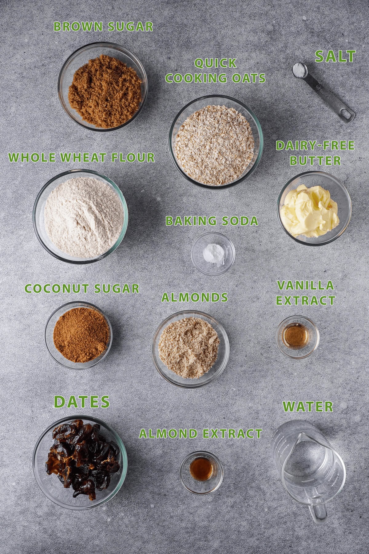 There are 2 layers of a delectable oatmeal crust that are filled with a sweet date mixture and baked into a vanilla/almond scented treat.